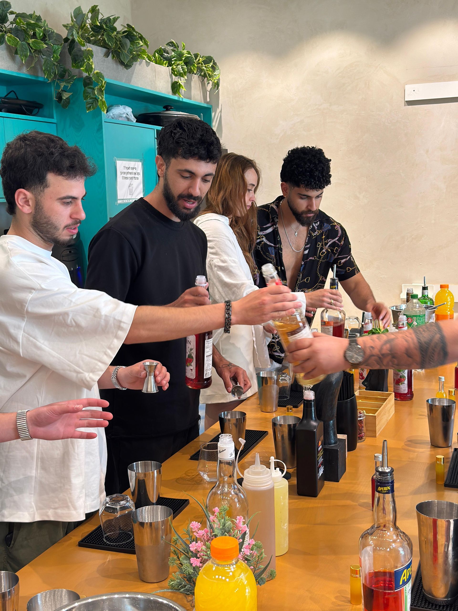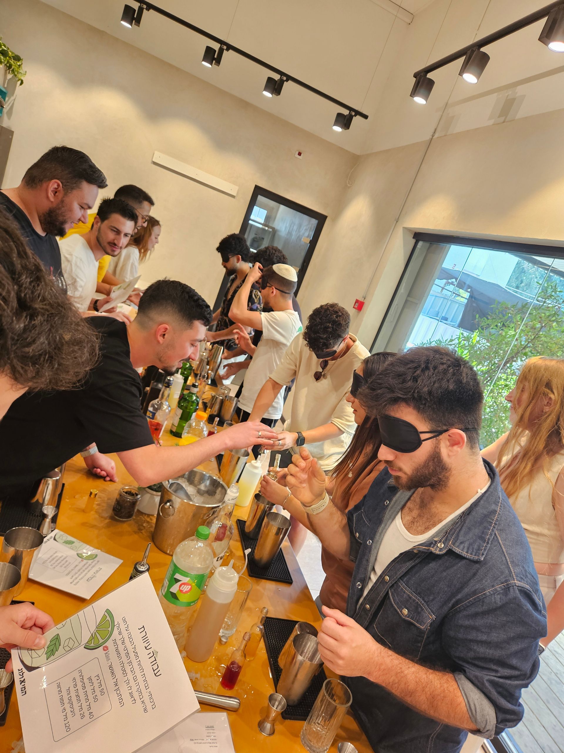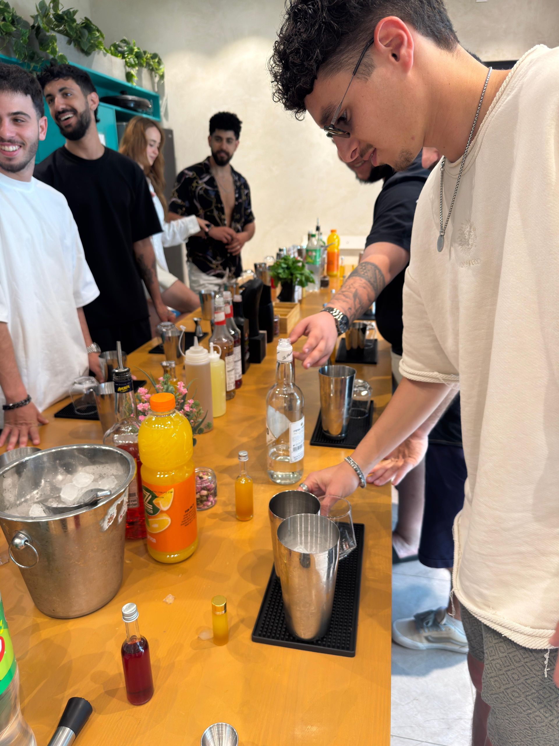 בסדנת קוקטיילים שלנו לכל משתתף יש את העמדת קוקטיילים הפרטית והמקצועית שלו בין אם מדובר בשייקר, ג'יגר (כוס מדידה), כלים כאלה ואחרים, קרח אלכוהול וכו'.